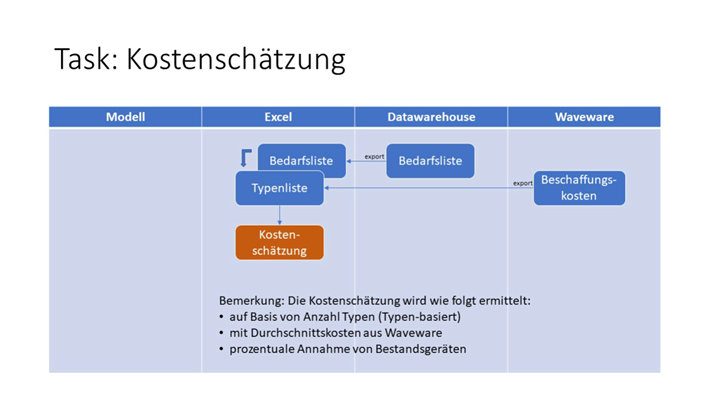Die Kostenschätzung ist typenbasiert. Während der Kostenschätzung werden die Kaufpreise der vorhandenen Geräte berücksichtigt. Im Prozess soll der Typenname und die WavewareAnlagenbezeichnung gemappt werden. Somit hat man historische Preis Informationen für Geräte. Neue Geräte-Typen, die in der Liste der vorhandenen Geräte nicht vorkommen, müssen auch bepreist werden.