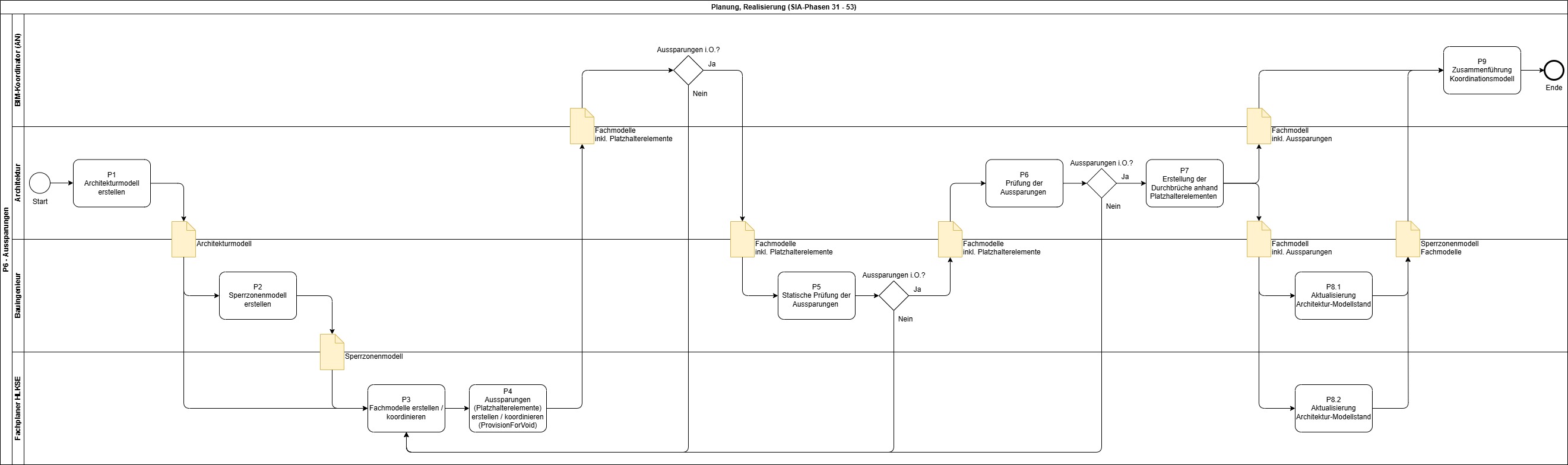 Verwendung der BIM-Modelle zur Koordination und Kontrolle der Aussparungen, wobei die Informationen während des gesamten Prozesses koordiniert und aktualisiert werden. Die Aussparungen werden auf Basis der koordinierten BIM-Modelle generiert. Die Prüfung und Freigabe erfolgt durch den BIM-Koordinator. Die freigegebenen Aussparungen dürfen nur mit Freigabe durch den BIM-Koordinator geändert werden.